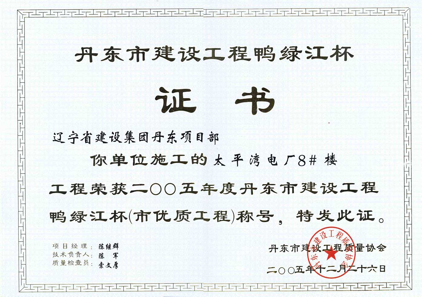 太平湾电厂住宅小区工程:位于丹东市鸭绿江畔,建筑面积44000平方米,框架剪力墙结构,先后荣获辽宁省优质主体结构工程奖和丹东市建设工程鸭绿江杯。